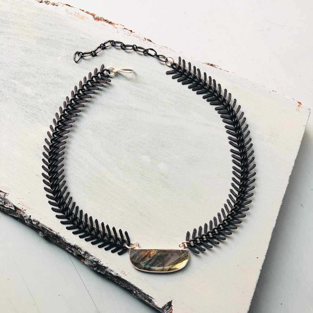 Elegant specialty plated chain cradles a semi precious one of a kind stone.  Length: Adjustable 15"-18"  Metal: Electric Plate Stones: Moonstone, ...